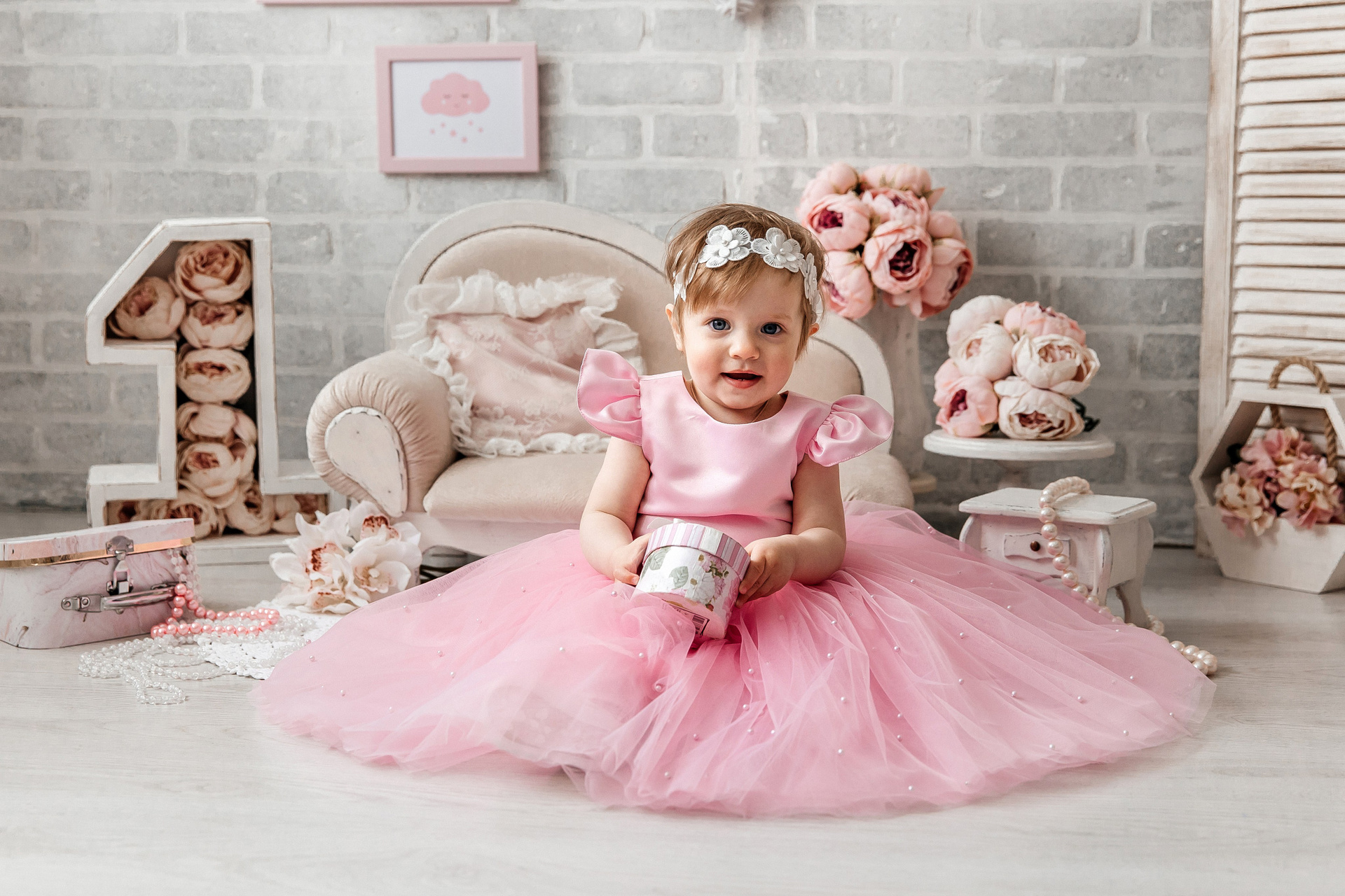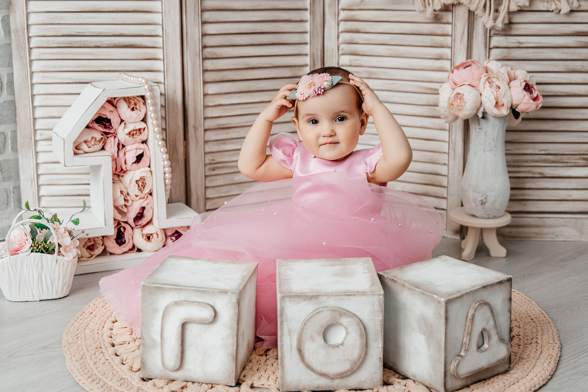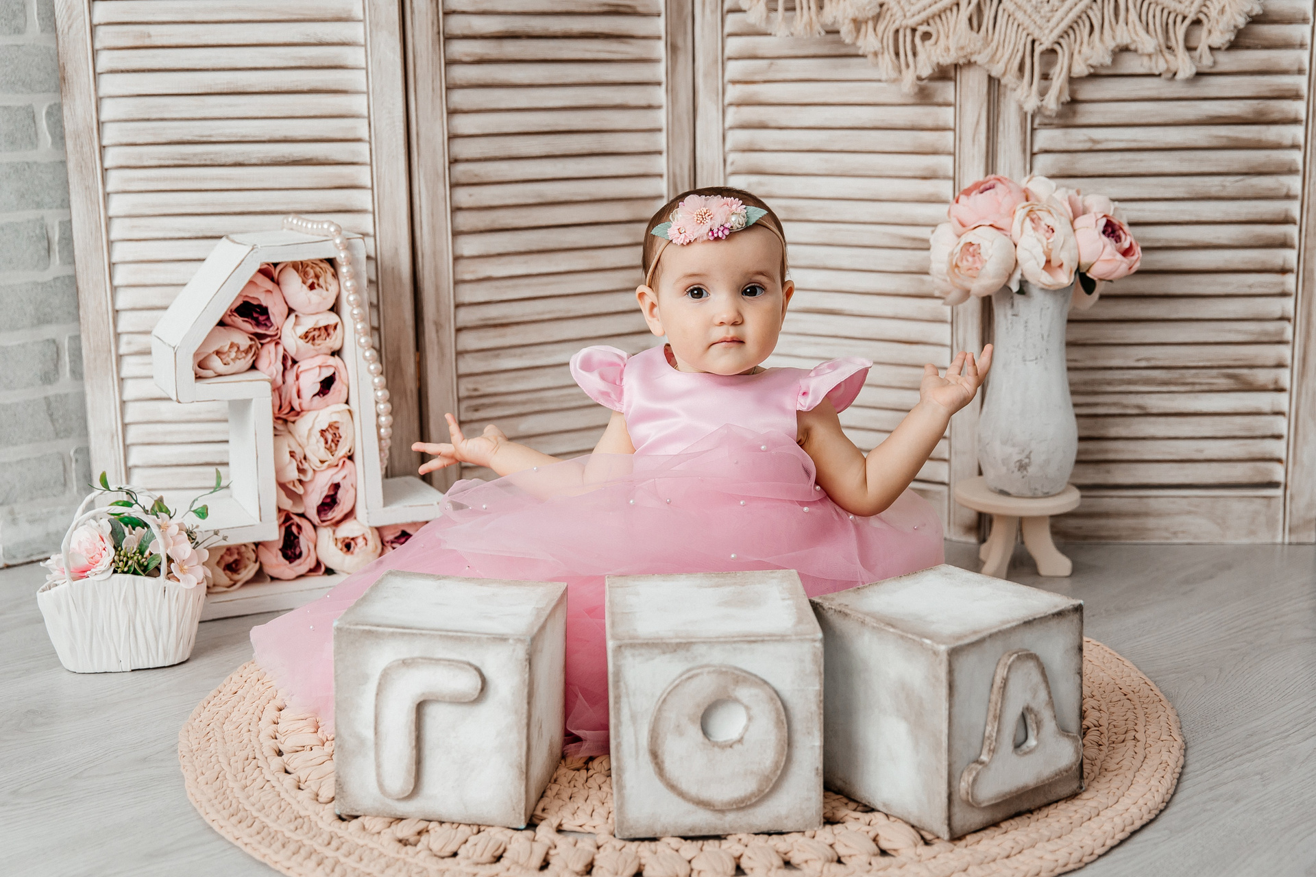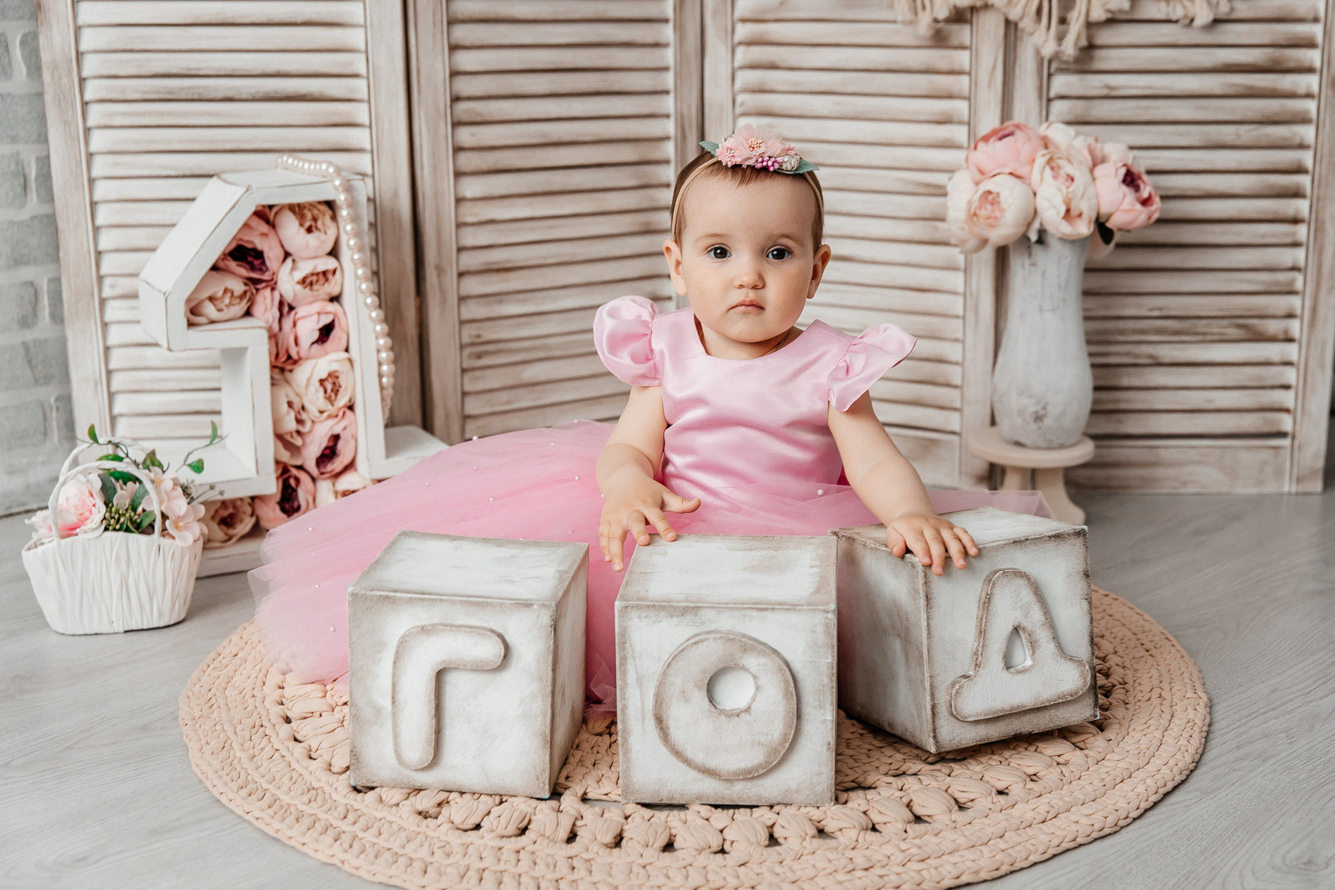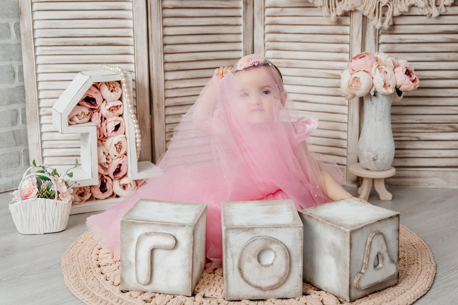 Минимализм (единичка, буквы-кубики, отдельный реквизит на фоне)